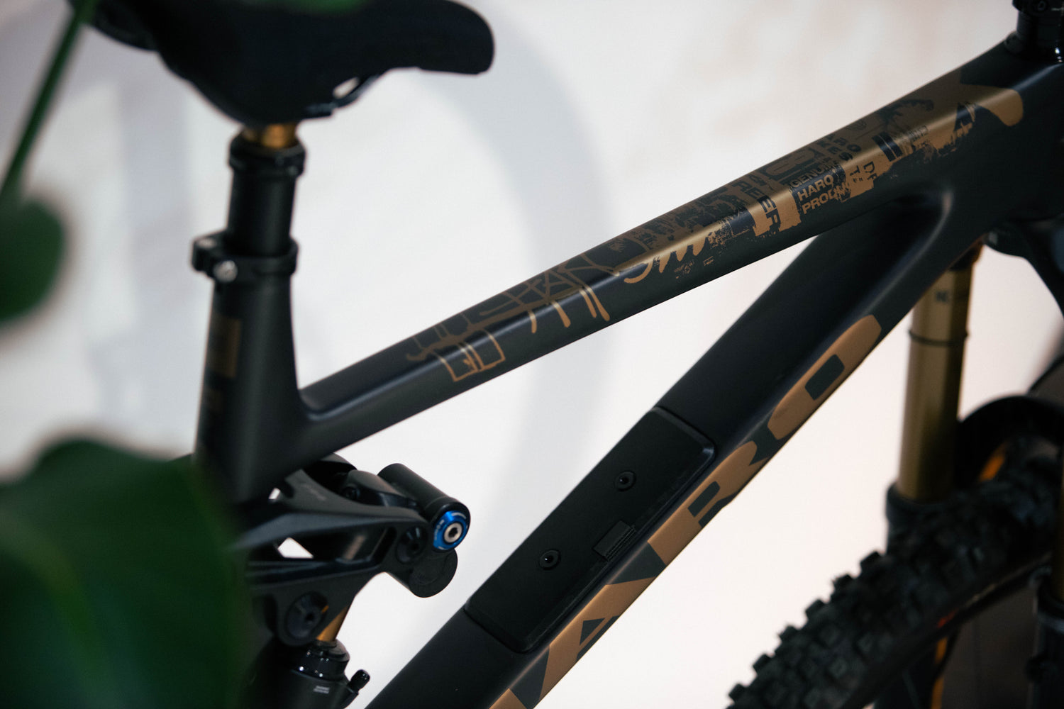 Close-up of Haro Bikes’ Greer Carbon Top Shelf frame, Fox 38-Float-Factory fork, chain, gears & Pirelli tire on a carbon MTB.
